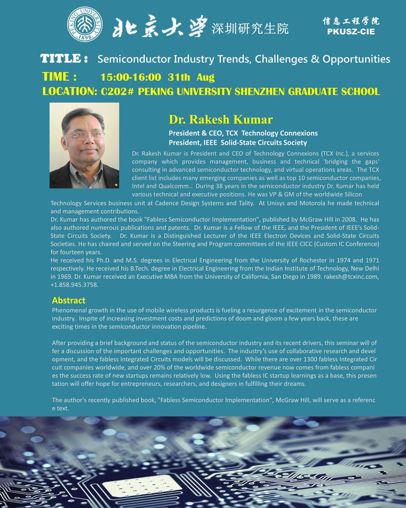 【讲座通知】8月31日,Dr. Rakesh Kumar :Semiconductor Industry Trends, Challenges & Opportunities