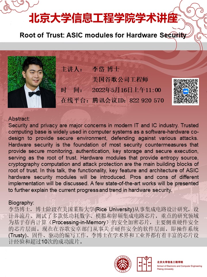 【学术讲座】李岱博士(美国谷歌):Root of Trust: ASIC modules for Hardware Security