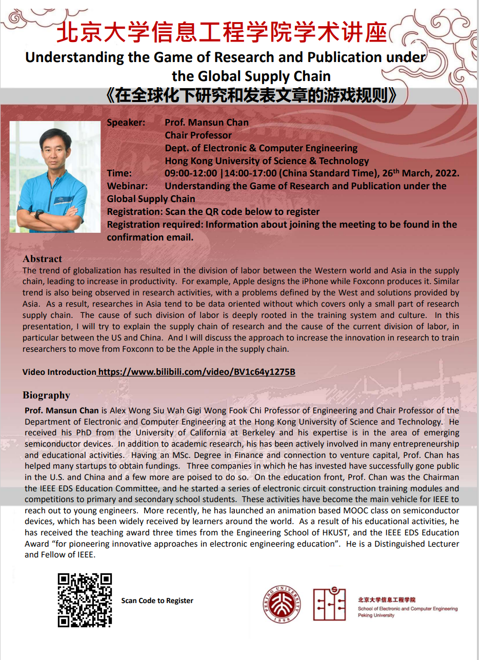 【学术讲座】Prof.Mansun Chan:Understanding the Game of Research and Publication under the Global Supply Chain