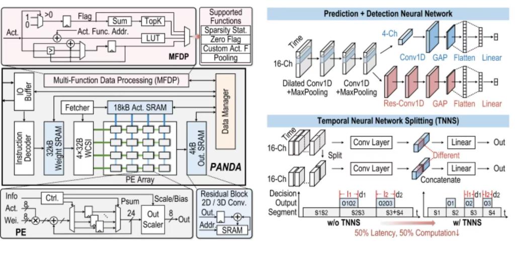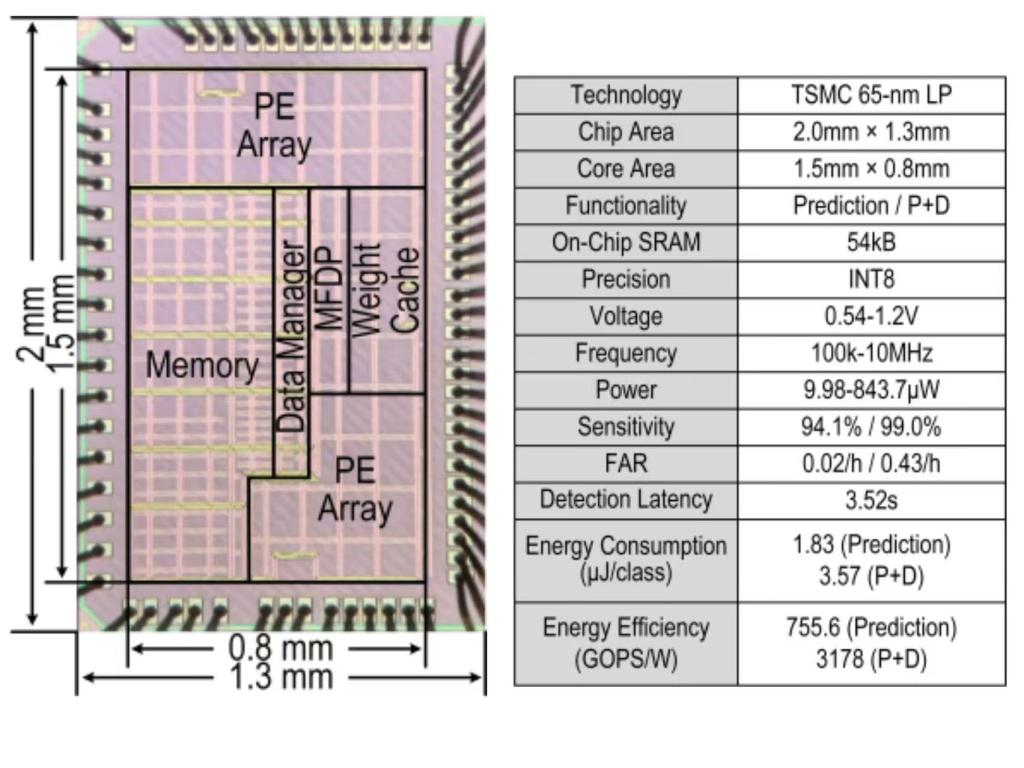 癫痫是一种由脑神经元异常放电引发的慢性神经系统疾病,全球患者人数超过6500万。由于癫痫发作具有突发性和不可控性,患者时刻面临着健康风险。可穿戴智能设备对于癫痫患者在非医院环境下的健康监测至关重要。此类设备提供的长期实时癫痫发作监测能显著降低看护成本,同时提升患者的生活质量。此次High漫 的研究工作旨在解决当前用于超低功耗可穿戴智能设备的癫痫监测处理器在癫痫识别性能与能耗之间难以兼顾的问题。该研究工作开发了一种可配置的癫痫预测+检测神经网络加速器PANDA。该研究提出了一种轻量级预测+检测癫痫监测框架,在保证高分类性能的同时实现了低计算复杂度。并通过采用时序神经网络分割技术,有效降低了计算延迟与计算量。加速器采用通道优先、输出固定数据流架构,结合激活值跳零技术和通过统计信息优化的权重缓存,显著提升了加速器的能效。此外,通过自定义指令集设计,该加速器具备高度可配置性,可灵活支持不同神经网络的部署。该工作采用了65纳米工艺进行了流片验证。在癫痫监测任务中,芯片实现99%的灵敏度、0.43次/小时的误报率,以及最高3.178TOPS/W的能效表现,达到国际领先水平。