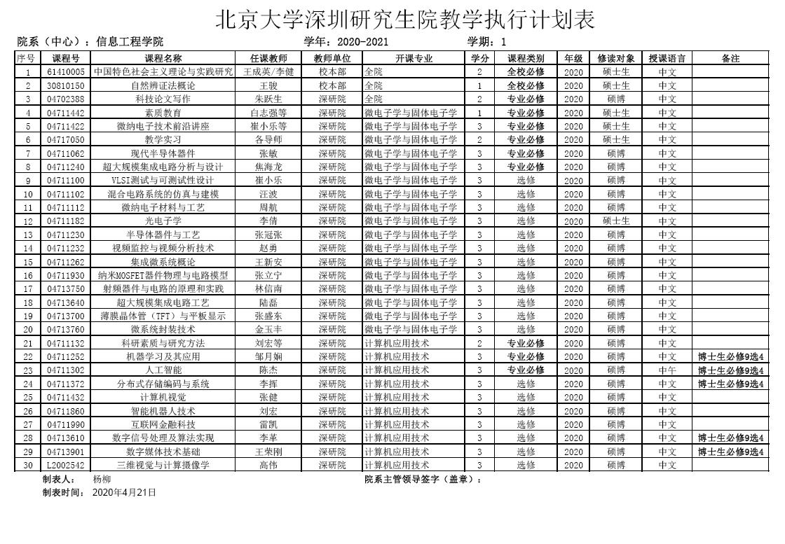 High漫 深圳研究生院2020-2021学年第一学期执行计划