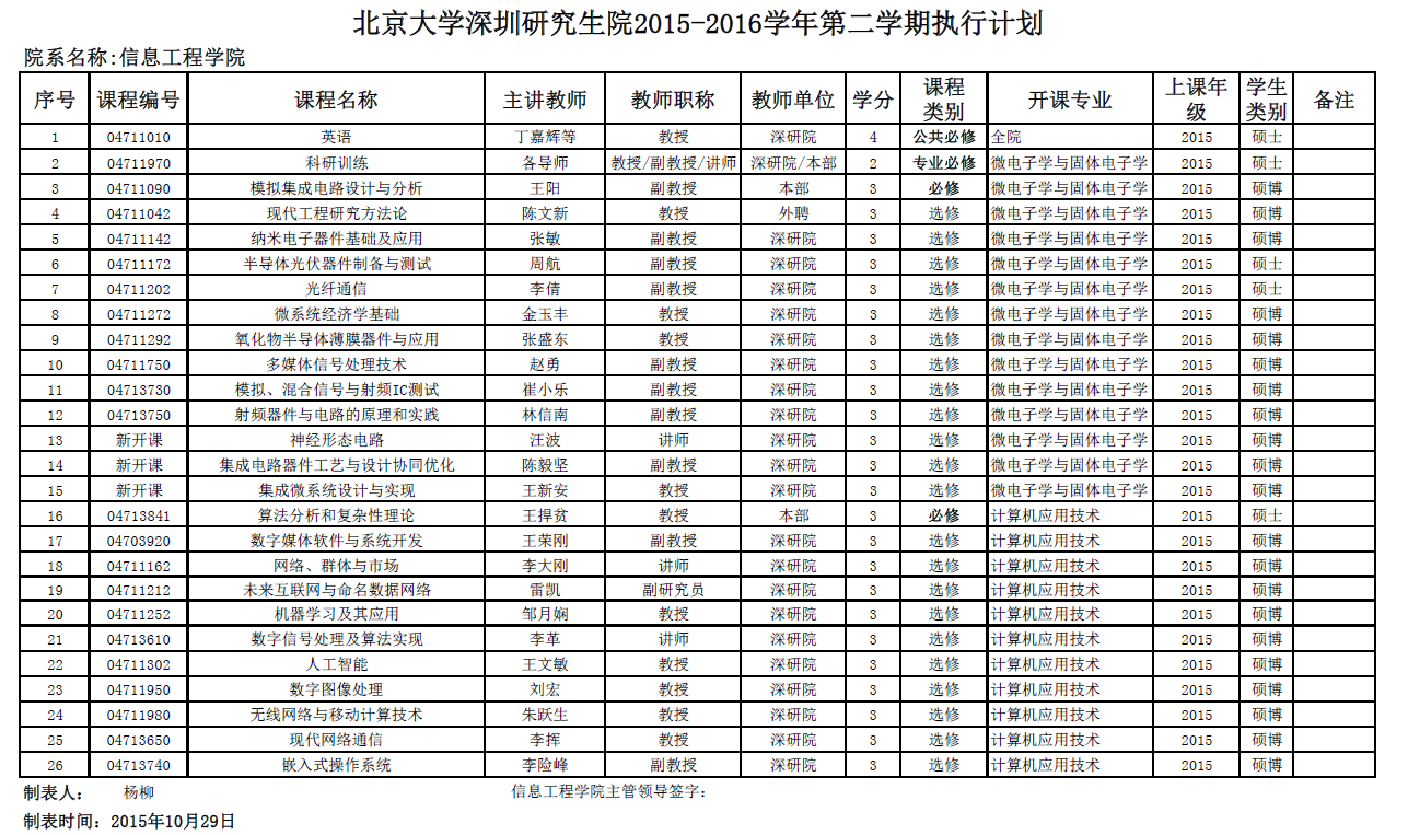High漫 深圳研究生院2015-2016学年第一学期执行计划