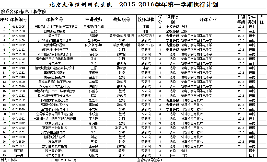 High漫 深圳研究生院2015-2016学年第一学期执行计划