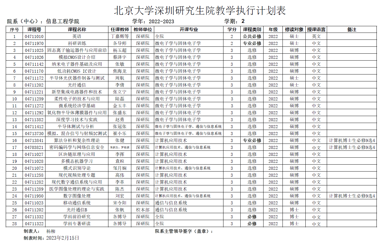High漫 深圳研究生院2022-2023学年第二学期执行计划
