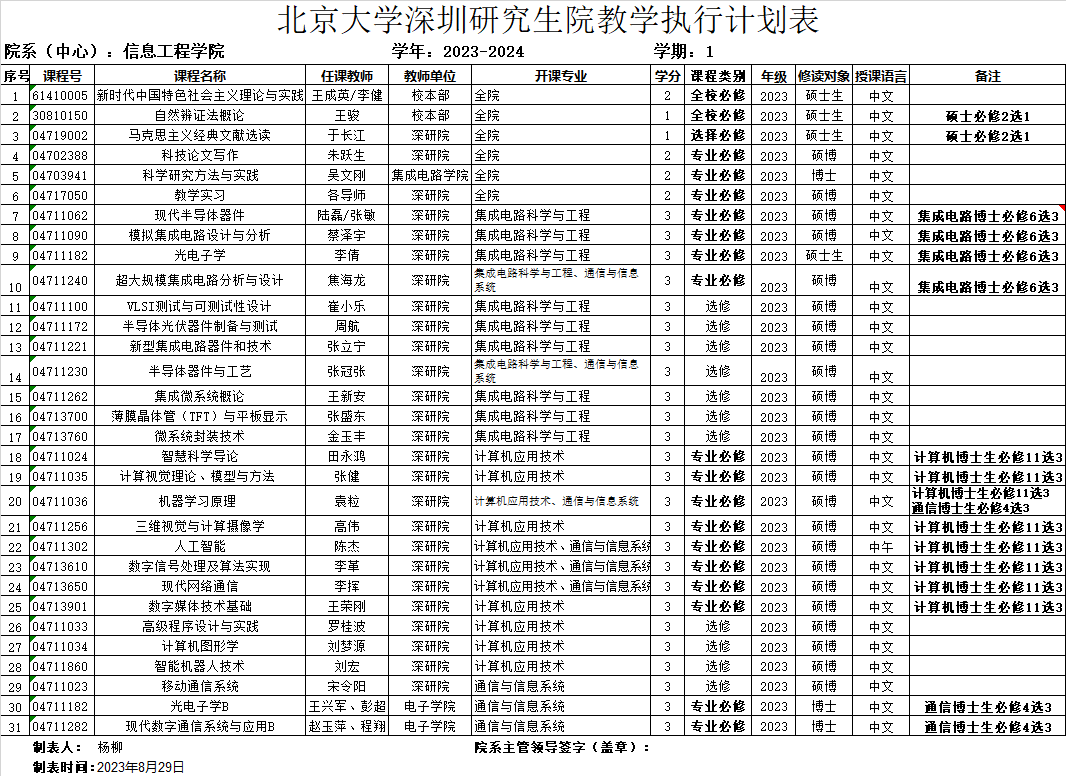 High漫 深圳研究生院2023-2024学年第一学期教学执行计划
