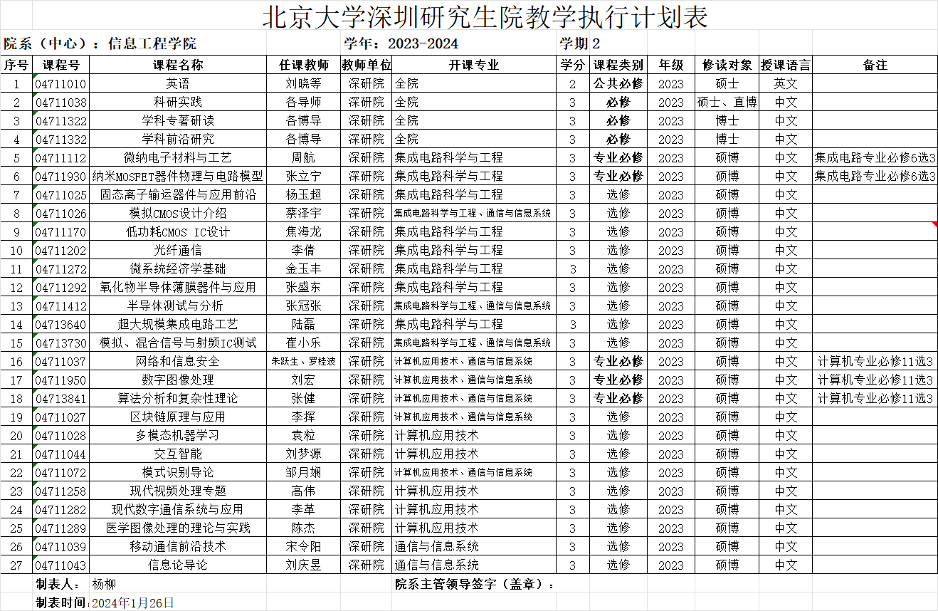 High漫 深圳研究生院2023-2024学年第二学期教学执行计划