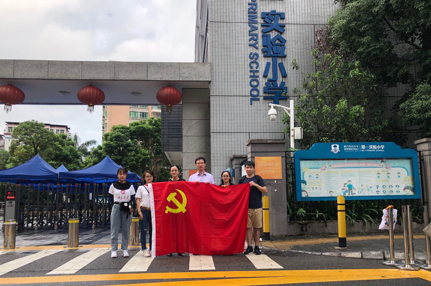 图1 团队一行人抵达南方科技大学第一实验小学,并与党旗合影
