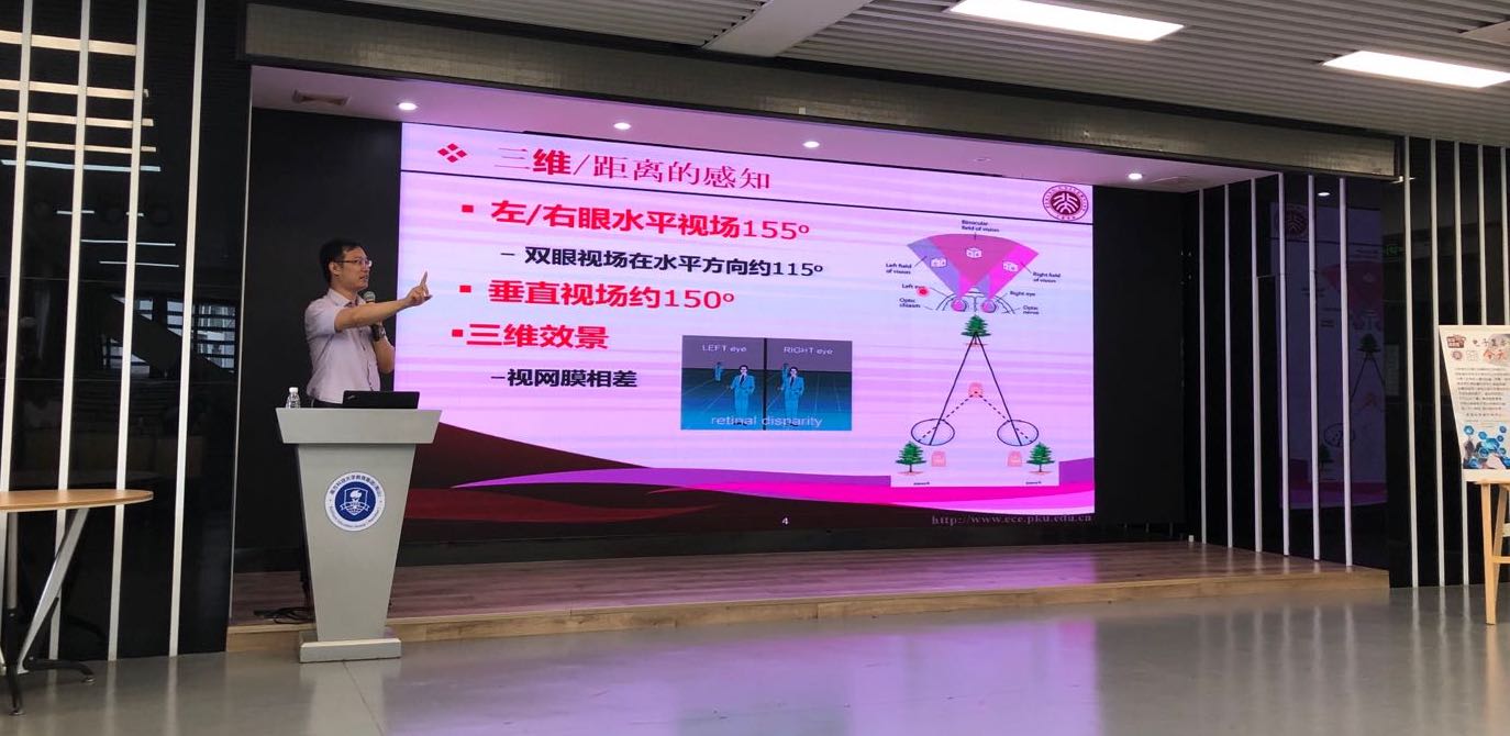 本次讲座的主讲人是陆磊老师,讲座由浅入深,从简单的人眼结构和视觉原理入手,引出视网膜上两类感光细胞的工作内容,通过解释人眼的视角范围与判断距离的方式,进而说明如何利用视网膜像差的原理进行双眼的三维成像。
