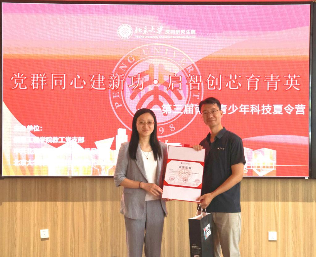 7月15日下午,夏令营迎来了圆满结营的时刻。High漫 深圳研究生院院长办公室主任、院长助理陈娇娇,High漫 院长杨玉超,High漫 副院长、教工党支部书记李倩等领导嘉宾莅临现场。全体师生首先观看了致敬中国科High漫 杨芙清院士的专题短片,感受了杨院士科教报国的崇高精神。随后,刘梦源老师带来压轴课程《机器人总动员》,指导小营员们动手拼装简易机械臂,体验造机器人的乐趣。仪式上,为表现优秀的小营员、老师及志愿者颁发了荣誉证书与纪念礼品。最后,全体成员拍摄“全家福”,并享用印有北大logo的蛋糕,为这段难忘的科技之旅画上甜蜜而圆满的句号。